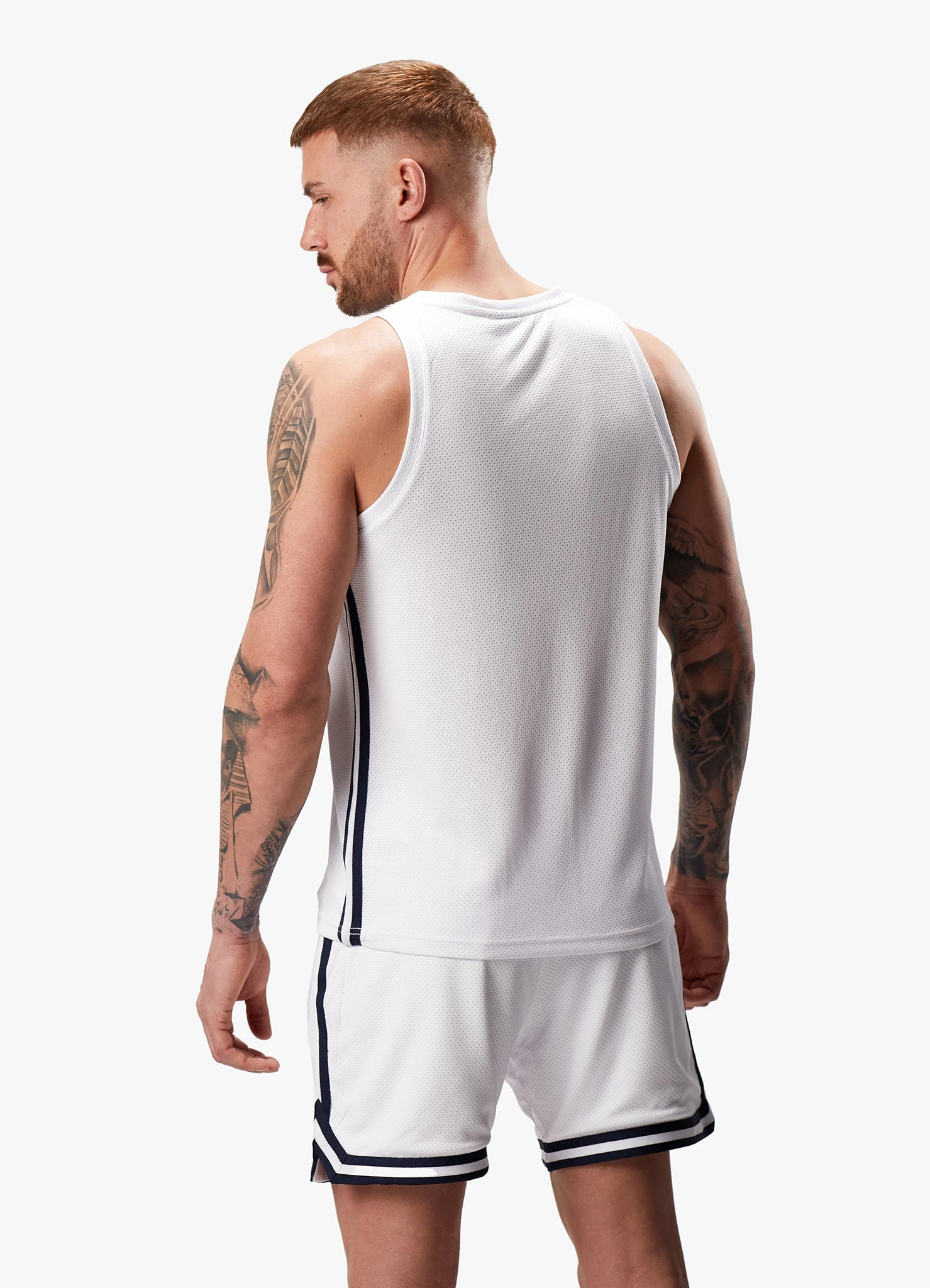 - Navy stripe detail on sides